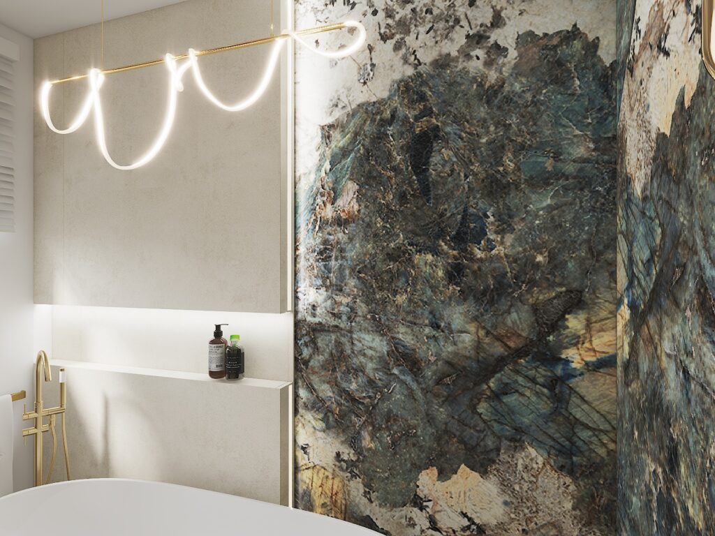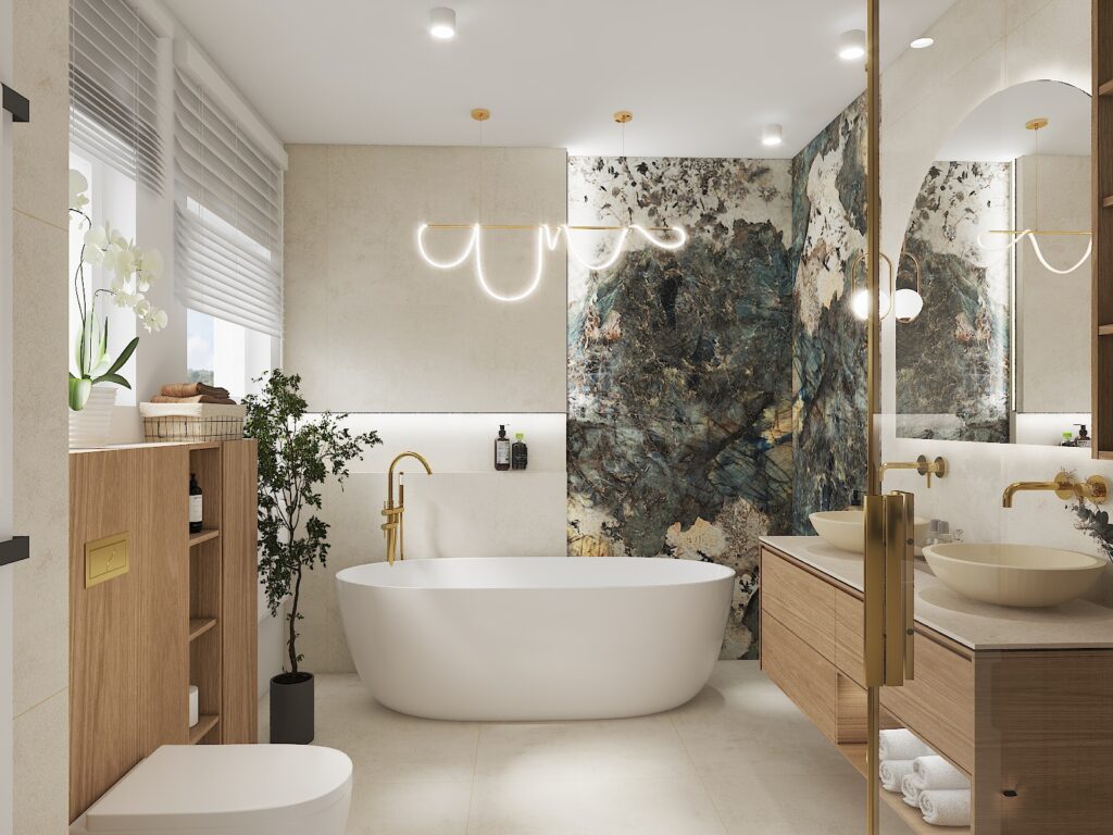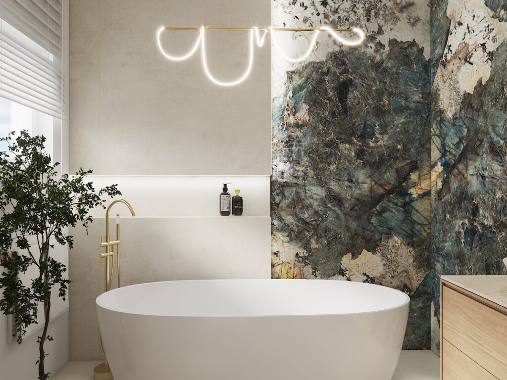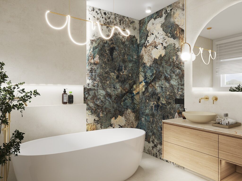 Nad majestatyczną, dużą, owalną wanną wolnostojącą króluje zjawiskowa ledowa lampa, która niczym klejnot rozświetla przestrzeń. Całości dopełniają dyskretne podświetlenia pasków LED na ścianach, kreujące nastrojową atmosferę.