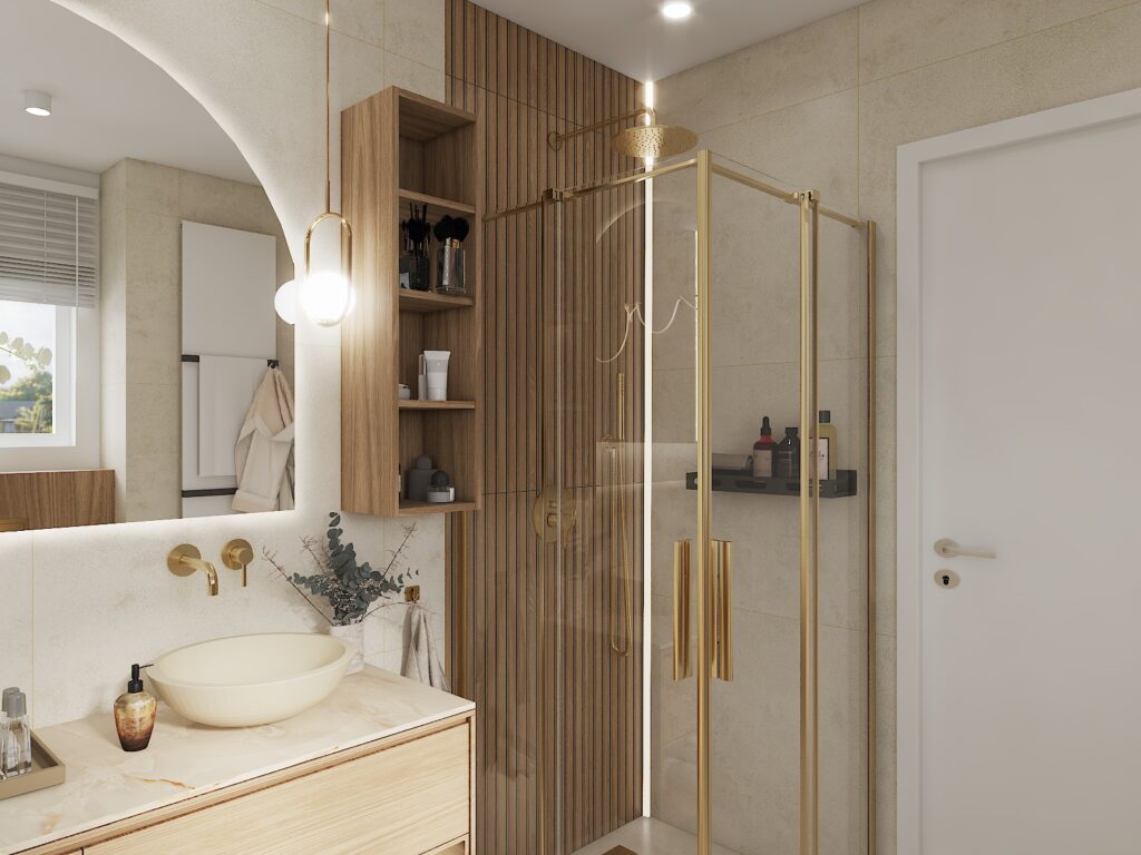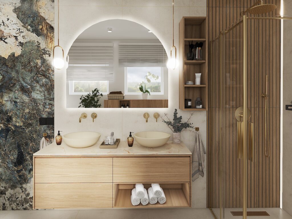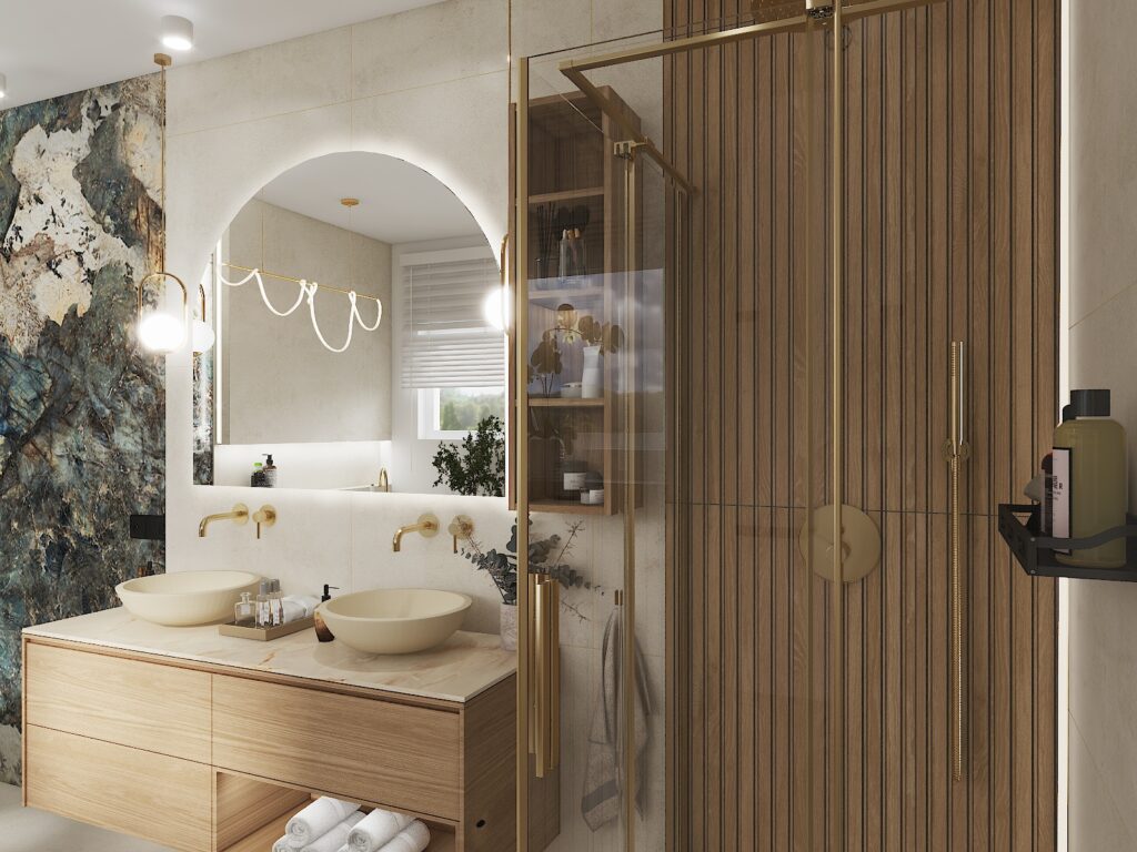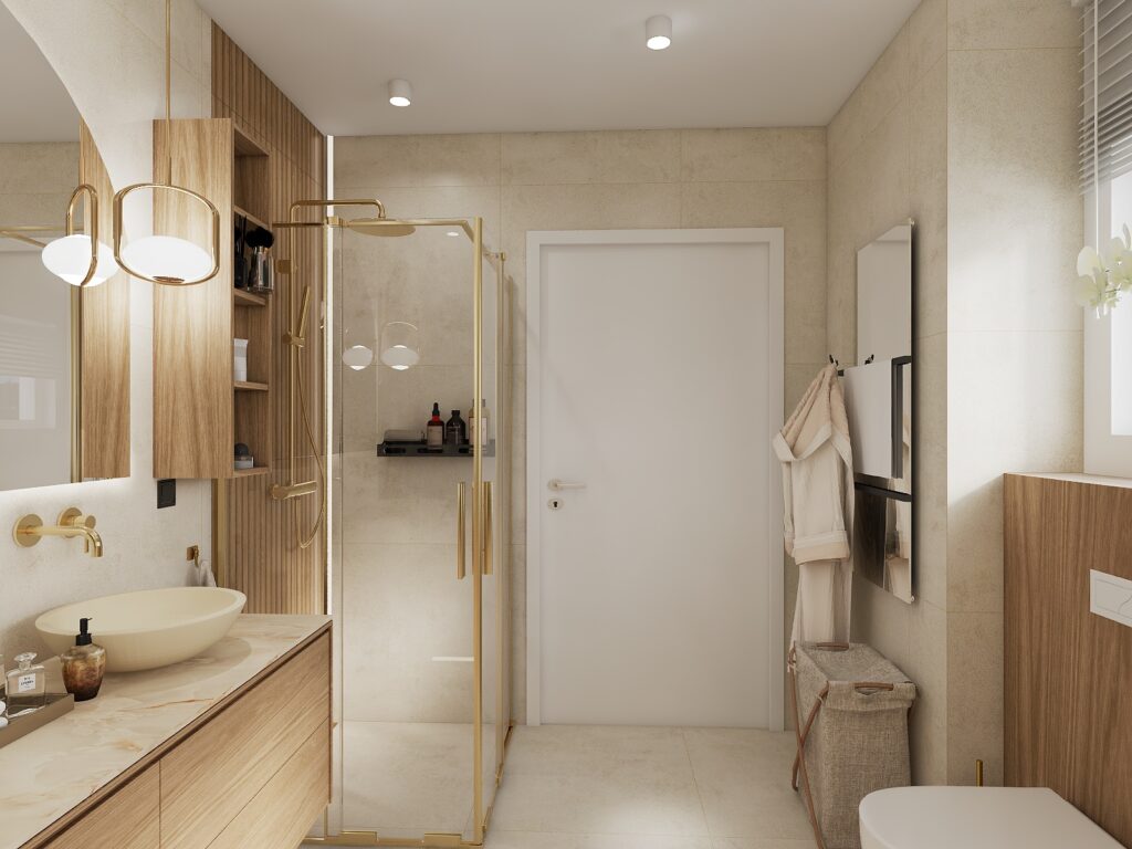 Ciepło i przytulność wprowadza dekor z drewna, a blask baterii w kolorze szczotkowanego złota oraz złotych opraw oświetleniowych dodaje wnętrzu królewskiego sznytu.