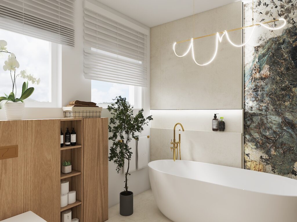 Zapraszam do świata zmysłowego relaksu w zaprojektowanym przeze mnie pokoju kąpielowym.
