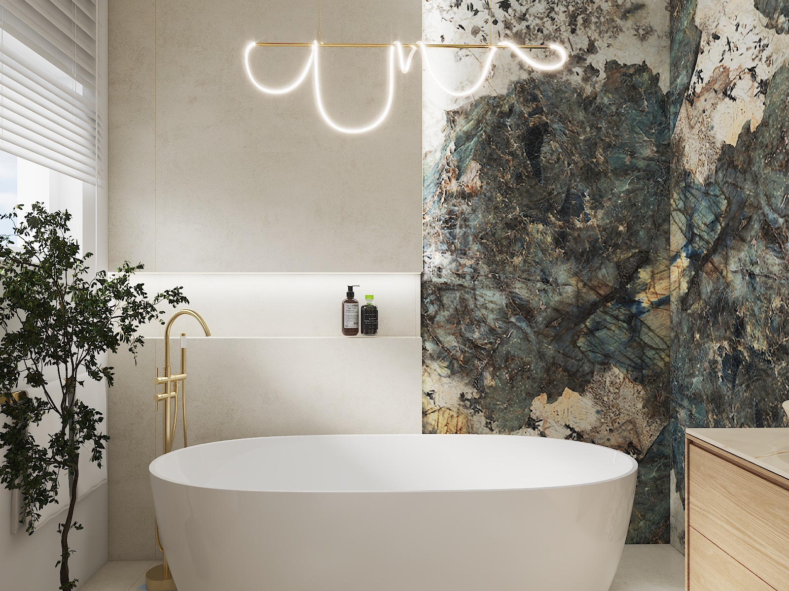 Nad majestatyczną, dużą, owalną wanną wolnostojącą króluje zjawiskowa ledowa lampa, która niczym klejnot rozświetla przestrzeń. Całości dopełniają dyskretne podświetlenia pasków LED na ścianach, kreujące nastrojową atmosferę.